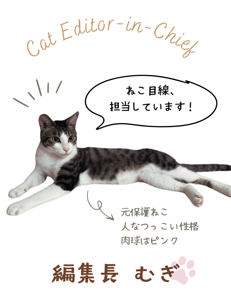 ぼくは編集長として、ねこ目線で考えたことをねこたちを代表してお伝えします!さらに、頼もしいねこライターたちも一緒に記事づくりに参加しています。